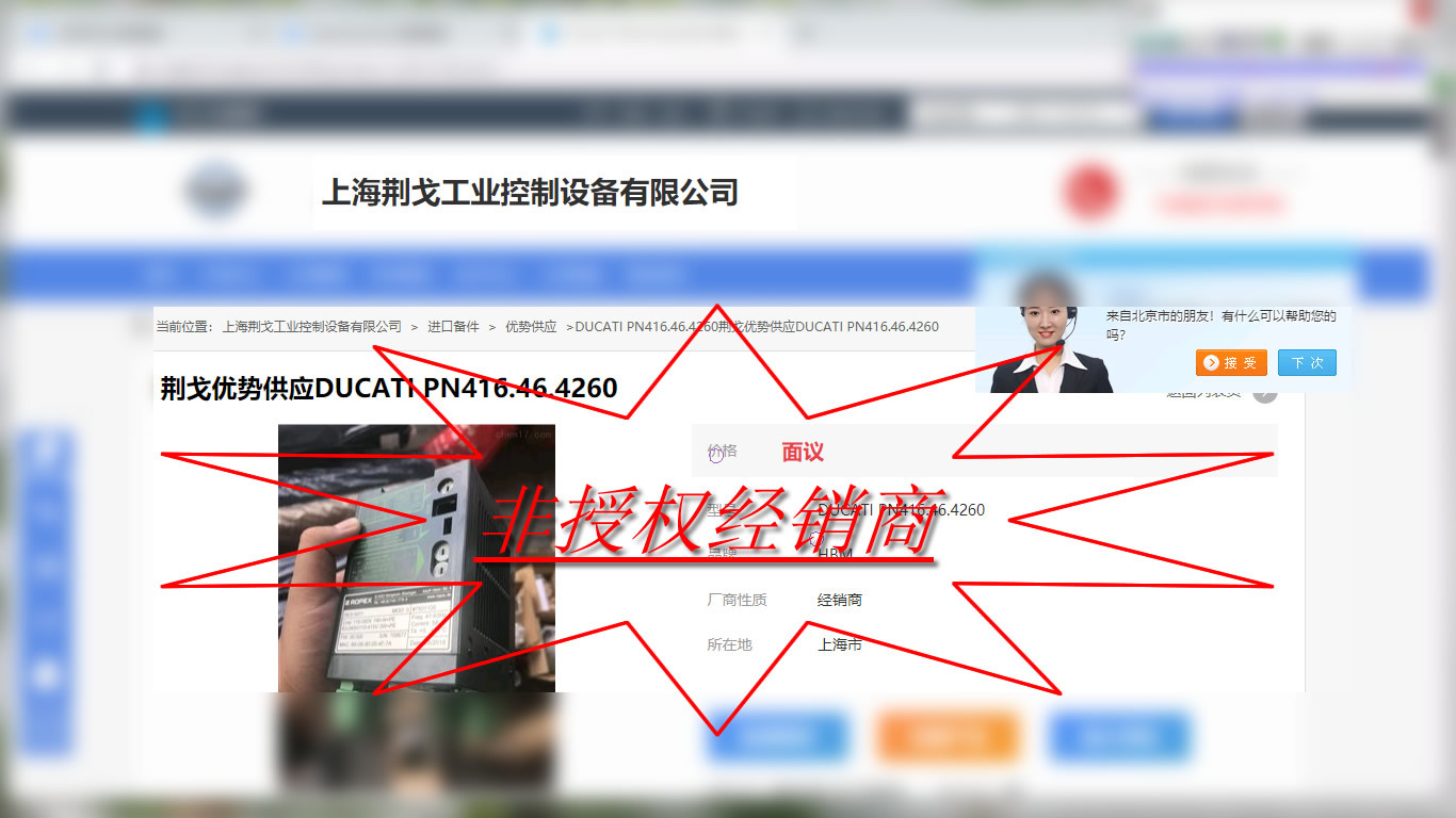 上海荆戈工业控制设备有限公司在互联网上的一些商城等第三方网站发布DUCATI energia 产品广告,经常文不对题(或图),张冠李戴。其实,该公司与DUCATI energia S.p.A. 意大利督凯提能源股份公司及其中国地区总代理(北京博度科技发展有限公司)没有任何代理授权。